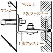 L字型の1次ファスナーに前後と垂直の調節用のボルトやアンカー取り付け用の穴がルーズになっているので、高さと左右の調節はそこで行う。張り代が50mmと少なくてすむが、施工精度のバラツキが大きい